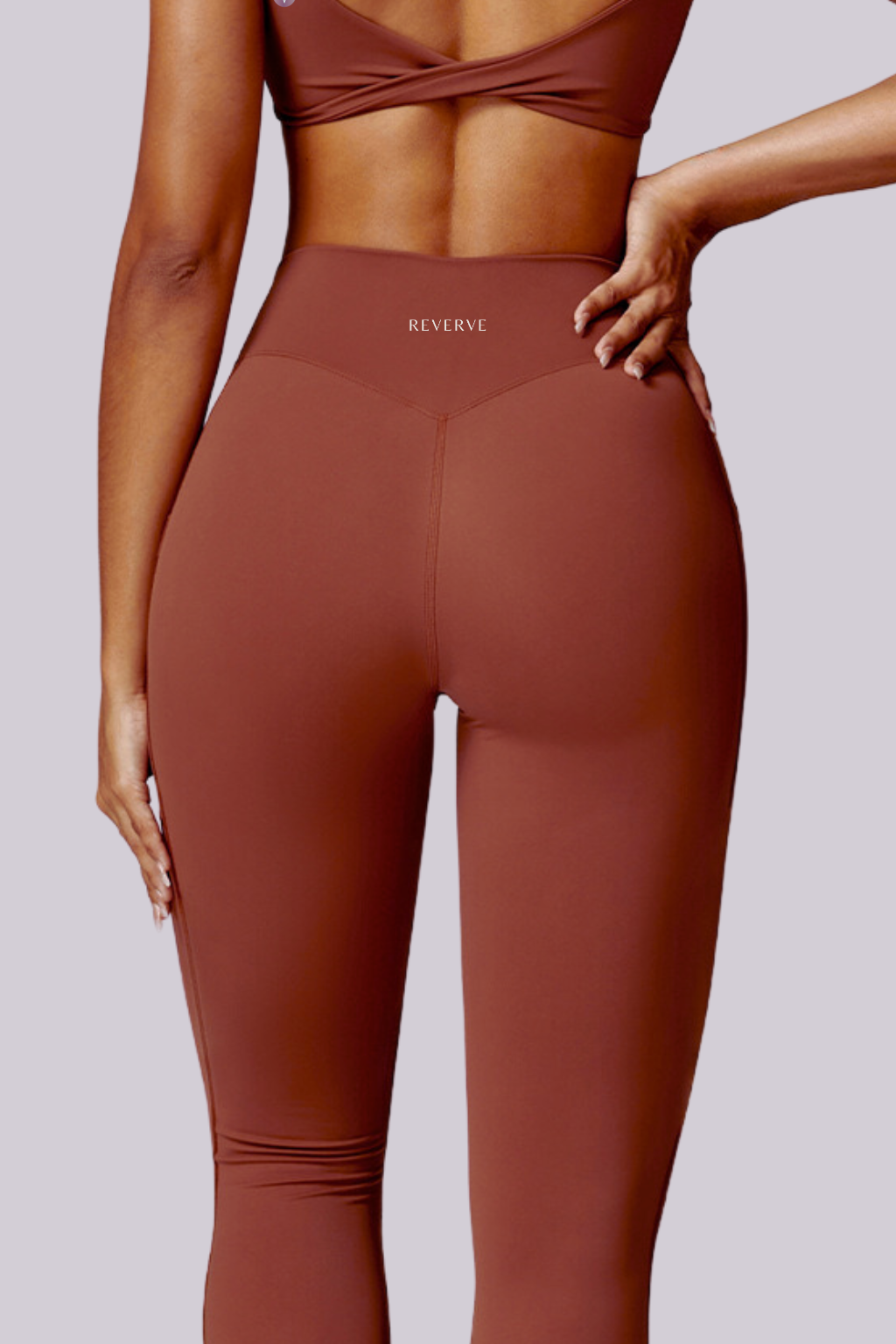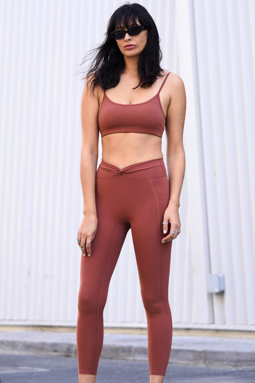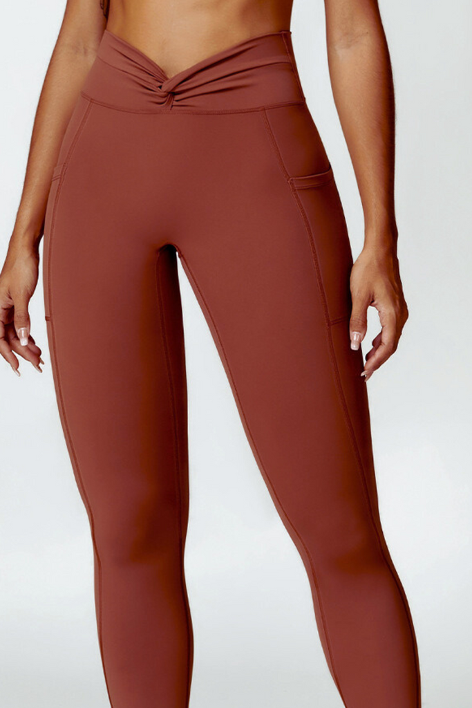 High-waisted leggings featuring a subtle twist detail at the waistband that accentuates the waistline. Made from a stretchy and smooth material, they contour the body while offering flexibility and support. The full-length design includes discreet side pockets, combining active with a modern, athletic look.